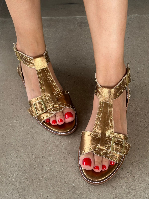Rasteira Couro Metal Ouro/Tiras Finas