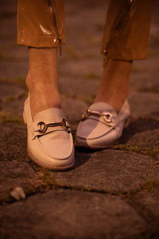 Mocassim Couro Off White Fivela Prata