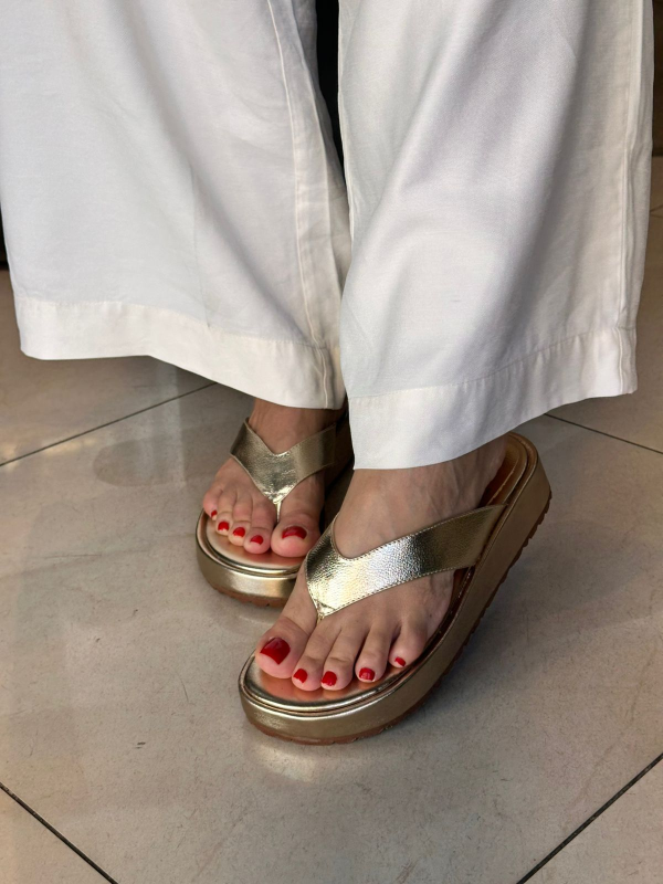 Sandália Anabela Couro Metalizado Ouro